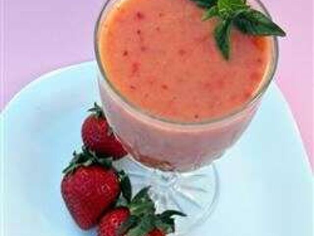 1. Поместите манго, папайю, клубнику, апельсиновый сок и кубики льда в электрический блендер. Обрабатывайте до тех пор, пока ингредиенты не станут гладкими.