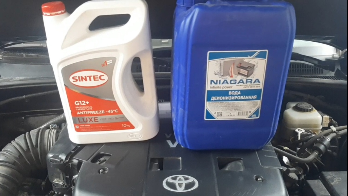 Нам понадобится антифриз G12 либо G12+. Я использовал готовый Sintec g12+ (-45), канистра 10кг. Дистиллированная либо иная очищенная вода для промывки системы от ранее залитого антифриза (я использовал 20л. и дважды вымывал старый антифриз из системы).