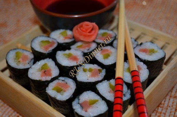 Роллы с семгой, огурцом и лимоном От автора: Роллы с семгой, огурцом и лимоном лучше отнести к русским роллам, такого сочетания ингредиентов вы не найдете ни в одном кафе. Ингредиенты: Рис для суши - 500 гр. Уксус рисовый - 70 мл. (4 ст. л.) Сахар - 40 гр. (1,5 ст. л. ) Соль - 10 гр. (1 ч. л.) Вода - 540 мл. (горячая) Огурцы консервированные - 200 гр. Лимон - 1 шт. Семга малосоленая - 200 гр. Листы морской капусты - 7 шт. Источник: https://rusdinner.ru/page/rolly-s-semgoj-ogurcom-i-limonom