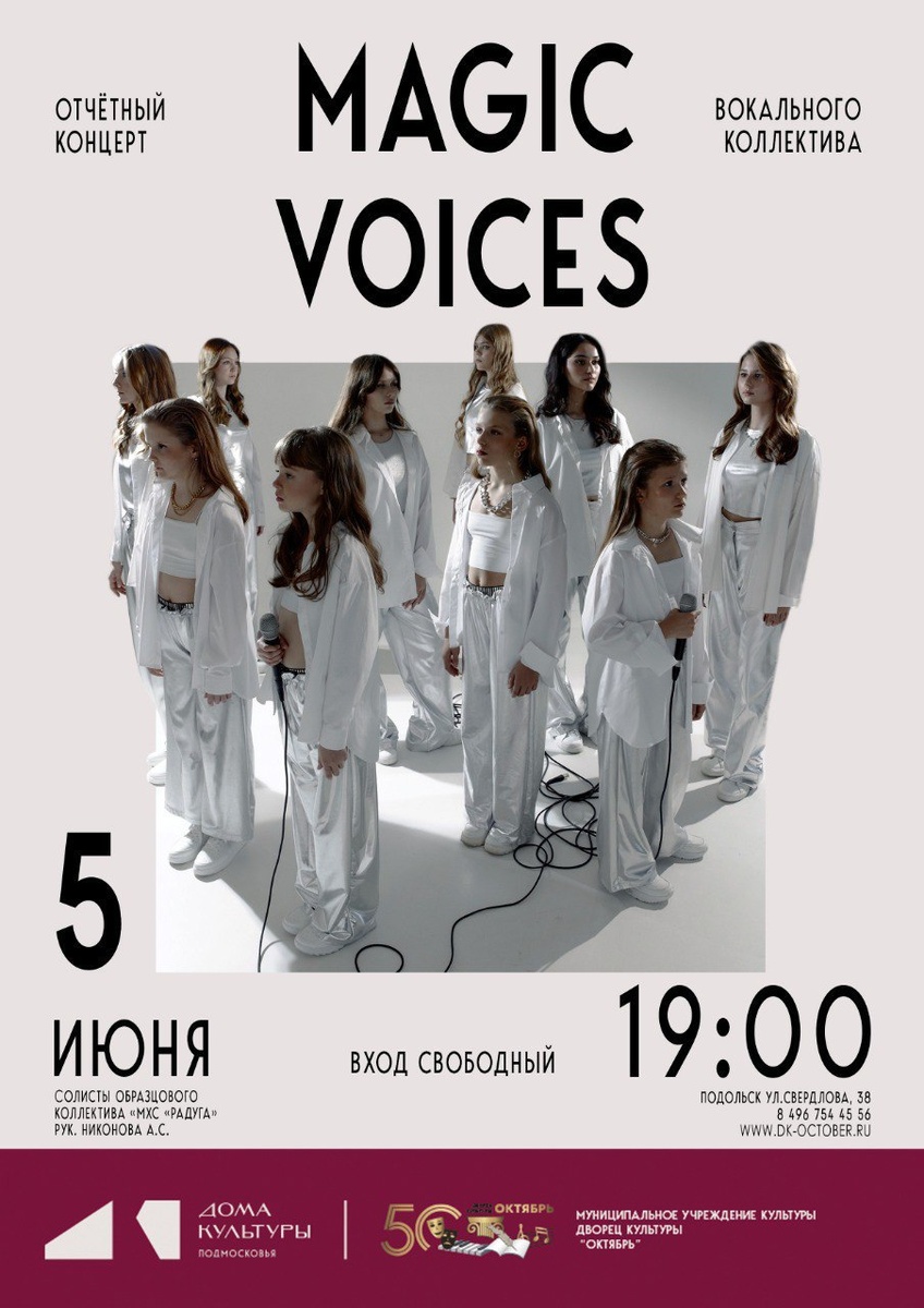 ✨ Отчетный концерт вокального коллектива "Magic Voices" 🎶В этот летний вечер порадовать зрителя своим творчеством и вокальным мастерством на сцену выйдут вокалисты в возрасте от 9 до 17 лет. 🎼В программе прозвучат российские и зарубежные кавер-версии популярных песен. 🚫 Возраст: 6+ 📆 05.06.2025 🕒 19:00 🏢 Дворец культуры «Октябрь» 📍 г. Подольск, ул. Свердлова, д.38 💰 Вход свободный❗️ ⭐Разместить публикацию ⭐Поддержать канал голосом ✅ Мероприятия Подольск https://dzen.ru/id/66ed500f7b5671493eca3fd6 http://vk.com/podolsk_events http://dzen.ru/podolsk_events