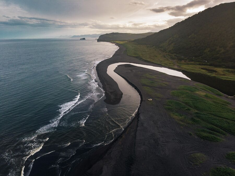 -Халактырский пляж: Уникальный черный песок из вулканического шлака. Стоишь на берегу Тихого океана, а за спиной – дымящие вулканы.