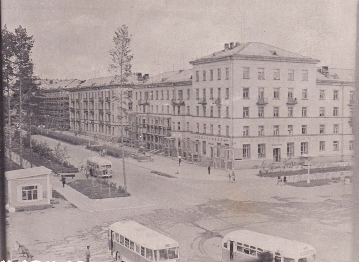 50/60-е..Коммуна-32 еще достраивается, но вывеска "Культтовары" уже висит. Коммуна-36 еще в "лесах" полностью. А автобусы, фонари какие?! И цветочный киоск напротив уже стоит.