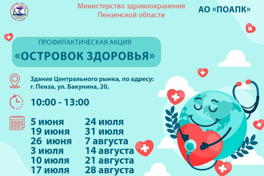 Летом 2025 года посетители Центрального рынка Пензы смогут получить консультацию медиков в рамках акции «Островок здоровья». Каждую неделю по четвергам с 10:00 до 13:00 любой желающий сможет пройти ряд медицинских процедур. Среди них: Первое мероприятие состоится уже в этот четверг, 5 июня. Также медики будут принимать жителей 19 и 26 июня, 3, 10, 17, 24 и 31 июля, 7, 14, 21 и 28 августа. Специалисты Пензенского центра общественного здоровья и медпрофилактики пояснили, что акция будет проходить по адресу: г. Пенза, ул. Бакунина, 20. Ранее появились данные о смертности в Пензе и области от злокачественных опухолей.