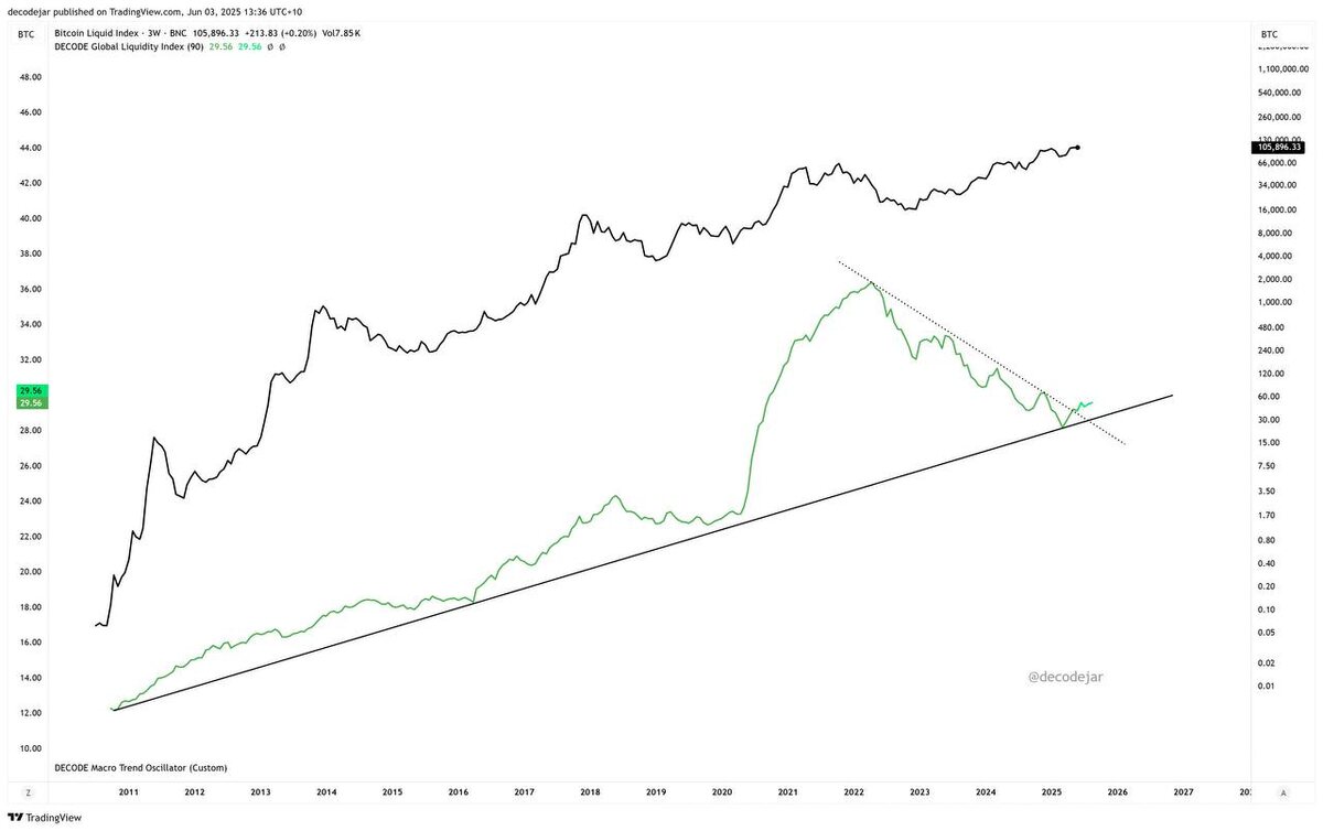 Почему биткоин растёт без печатного станка ФРС? Мы привыкли смотреть на M2 как главный источник ликвидности. Но есть нюанс: в этом цикле M2 растёт, а баланс центробанков — нет. Что это значит? — Денежное предложение увеличивается в основном через банковскую систему (кредиты, частные займы и т.д.) — А вот центральные банки — не включили печатный станок. Пока. На графиках видно: рост цены биткоина (чёрная линия) совпадает с отскоком глобального M2, но не с ростом активов на балансах ФРС, ЕЦБ и других. То есть — ликвидность есть, но это не QE-эпоха 2020. Особенно интересен тренд RoC (годовой темп роста ликвидности) — он позволяет увидеть поворотные точки раньше, чем сами графики. Что это значит для биткоина? 1. Рост идёт «на частных деньгах» — институционалы, трейдеры, ETF, корпорации. Это не халявный QE-рост. 2. Если CB включатся — это усилит тренд. А пока мы на полпути. 3. Слабая ликвидность замедляет темпы — это может объяснять консолидации и откаты после резких ростов. Такой се
