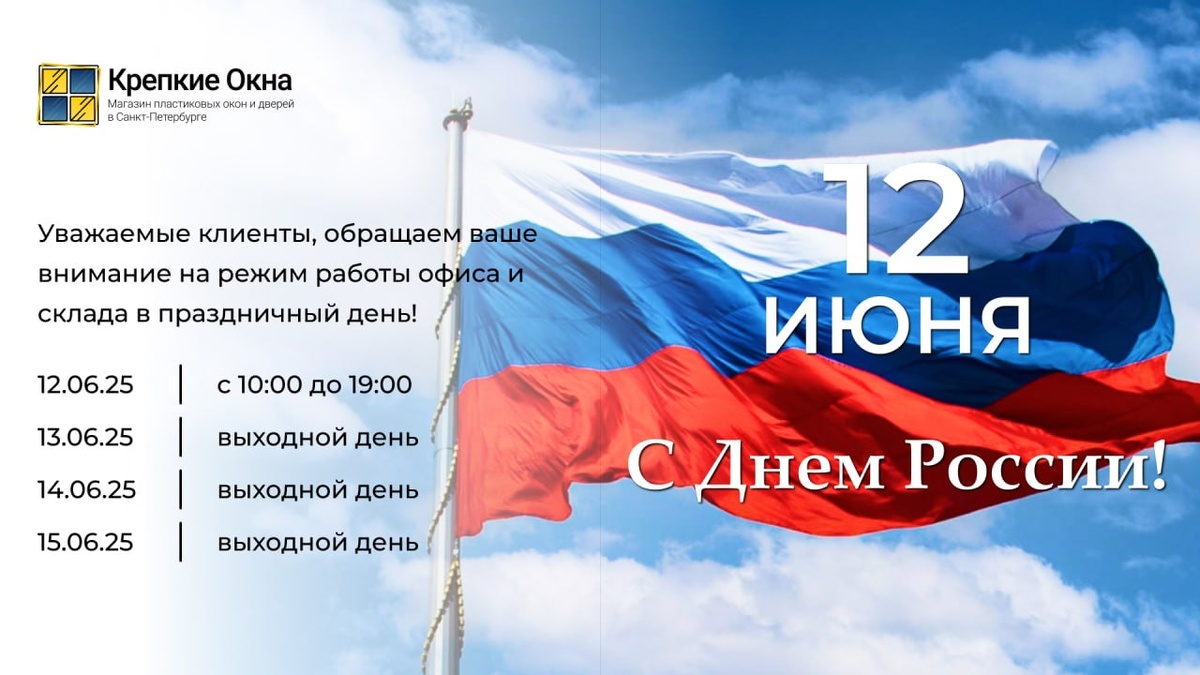 Дорогие клиенты! От имени всей команды Крепкие Окна, хотим сердечно поздравить вас с наступающим праздником "День России"! Этот замечательный день напоминает нам о богатстве и разнообразии нашей родины, ее истории и культуре. Мы хотели бы обратить ваше внимание на наш режим работы: 12.06.2025 - рабочий день с 10:00 до 19:00, 13.06.2025-15.06.2025 - выходные дни. Еще раз хотим поздравить вас с Днем России! Мы ценим вашу верность и благодарим вас за то, что выбираете нашу компанию. Желаем вам приятных праздничных дней, насыщенных радостью, гордостью и любовью к нашей прекрасной стране!