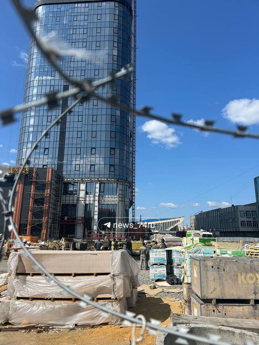 В ответ на пост 📸 Еще кадры с места пожара Видно немного обгорелые участки на земле. Пожарные сейчас всё проливают. Строители на удивление ходят спокойные, улыбаются. Такой внеплановый перерыв в работе получился.
