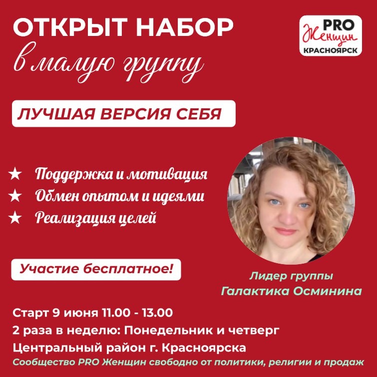 🔔 ОТКРЫТ НАБОР В ГРУППУ "ЛУЧШАЯ ВЕРСИЯ СЕБЯ" Участие безоплатное! 🎁 На связи лидер сообщества PRO Женщин Галактика Осминина: «Приветствую Вас, дорогие дамы! Меня зовут Галактика, и я рада пригласить Вас в уникальное пространство для женщин, которые как и я, стремятся стать лучшей версией себя Это будет группа поддержки, где мы сможем делиться своими историями, идеями и практиками, которые помогли нам на нашем пути 🫶 Я верю, что у каждой из нас есть ценнейший опыт, который стоит передать другим. Когда за плечами накоплено много знаний и навыков, приходит время делиться ими, чтобы освободить место для новых возможностей В нашем мини сообществе мы будем поддерживать друг друга, слушая и понимая разные точки зрения. Часто именно в чужих историях мы находим вдохновение и осознаем: «А, так можно было?!» Я приглашаю в нашу группу решительных женщин, готовых ставить перед собой цели и принимать ответственность за свои действия Если вы жаждете изменений и готовы сделать всё возможное
