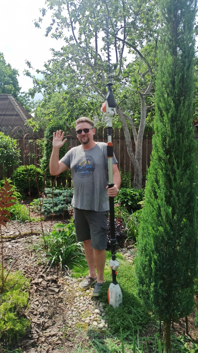 Из садово-приятного) Вчера приезжал Александр Высоконов и не просто проведать, а с важным делом👍 Которое он виртуозно проделал в нашем садике👌 Стрижка растений!!! Огромная благодарность за помощь🙏🙏🙏💚 Сама бы я возилась не меньше недели, я копуша и у меня нет такого инструмента, да и вряд ли я смогла бы им так ловко работать - тяжелый для женщины, пришлось бы ручным кусторезом. А неделя в высокий сезон - это ого-го как много!!! СПАСИБО!!! ... Кстати, снимала на видео, но смонтировать смогу не раньше выходных, а то и на следующей неделе. Реально, сезон взмыл до небес. Это радует, но, увы, садику меньше внимания и видео некогда делать.