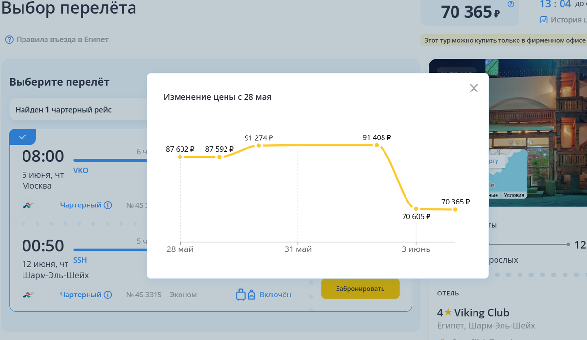Цены сбрасывает не Библиоглобус на Аэрофлоте. Случайно обратил внимание, увидев такие цены с вылетом 5 июня из Москвы. Простейший отель 4* Викинг, всего - 70 т.р.. за двоих. Судя по графику, падение цены на 20% Могу предположить, что за нюанс(об этом чуть ниже) Прямой перелет египетской чартерной авиакомпанией Red Sea Airlines, багаж 20, ручная кладь 5 кг. Путевки в пределах 90 т.р. на двоих вполне реально найти, но опять же повторюсь, с вылетом завтра При это БГ выставляет цены от 106 т.р, Хотя по факту тоже есть падение на 20% но у него перелет Аэрофлотом, в этом и есть существенная разница За такую цену можно взять и "пятерку", но без Аэрофлота Проблема в том, что у авиакомпании Red Sea Airlines всего два самолета (может 3) И как в случае с подобными АК, типа АльМасрия (Almasria Universal airlines), довольно часто происходят задержки и отменя рейсов. Негативных отзывов в интернете предостаточно. Даже любая небольшая техническая неполадка одного борта, потянет за собой мас
