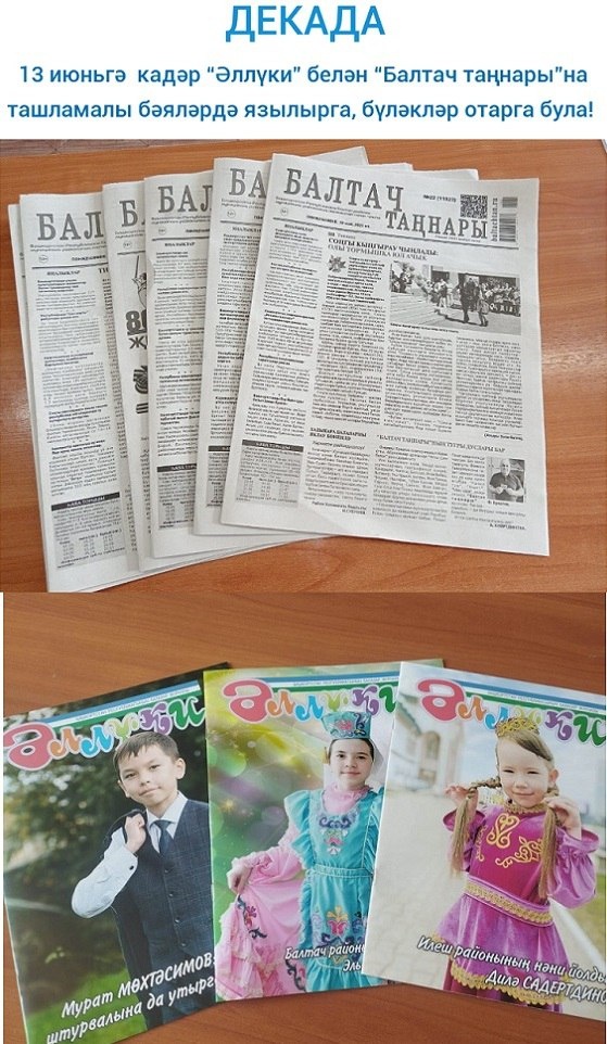 “Әллүки” белән “Балтач таңнары” абунәчеләре арасында бүләкләр уйнатыла! Бу чара матбугат басмаларына язылуның ункөнлеге барышында (13 июньгә кадәр) үткәрелә. Алдагы яртыеллыкка шушы басмаларга язылган балтачлылар квитанция күчермәләрен “Балтач таңнары” редакциясенә тапшырып уенда катнаша алалар. Һәр редакциядән өчәр җиңүче билгеләнәчәк. “Балтач таңнары” гәзитенә язылучылар Иске Балтач авылындагы бер сәүдә йортының бүләк сертификатына ия булачак. Ә “Әллүки”не алдыручылар — зонтик, термокружка һәм футбол тубы ота алалар. Басмаларга язылыгыз, бүләкләр отыгыз, дуслар!