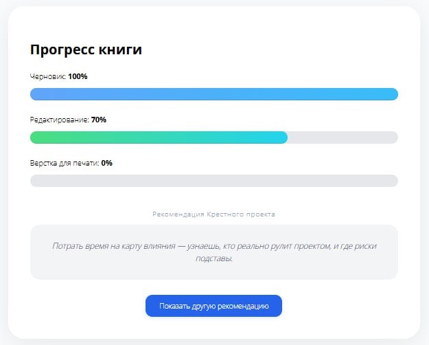 Сделал на странице отчет о прогрессе по написанию книги "Крестный проекта"