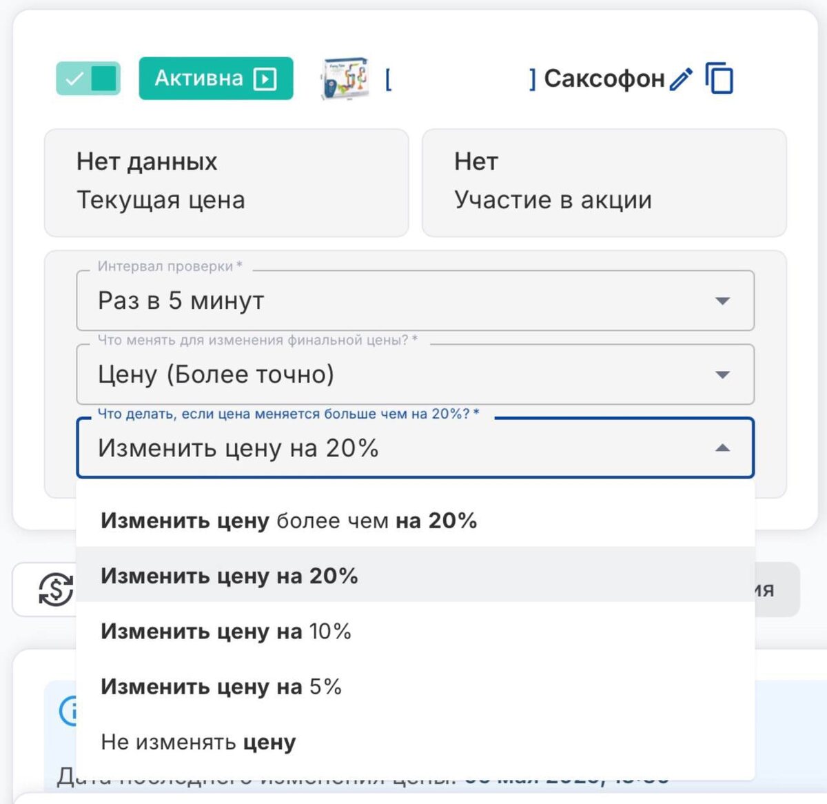 В автоценах на WB, Ozon и Яндекс.Маркете теперь можно задать более точные сценарии, если цена изменилась резко.