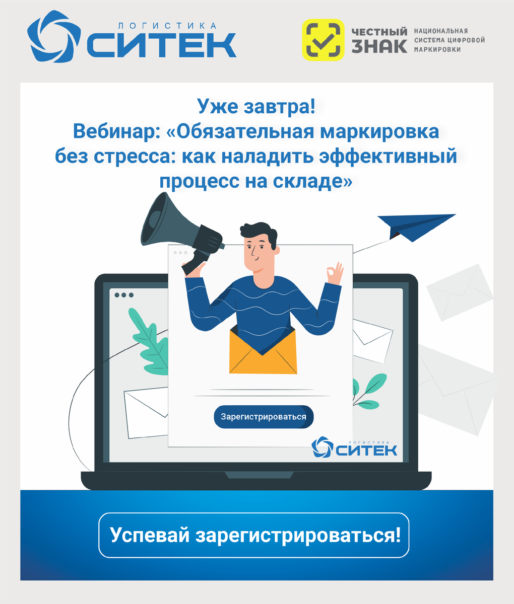 5 июня в 15:00 (мск) состоится онлайн вебинар на тему «Обязательная маркировка без стресса: как наладить эффективный процесс на складе». Участие в вебинаре бесплатное, необходимо предварительно зарегистрироваться на сайте! Маркировка товаров — это не только соблюдение законодательства, но и гарантия прозрачности и доверия клиентов. 👍 Получить ответы на вопросы в режиме реального времени; 👍 Узнать, как избежать ошибок при работе с маркировкой; 👍 Подготовиться к изменениям в законодательстве заранее. Регистрируйтесь прямо сейчас и узнайте, как адаптировать бизнес к новым реалиям!