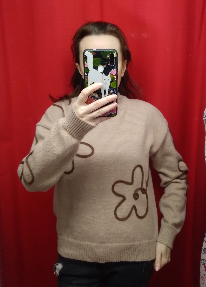 Здравствуйте, в секонде вам надоели недружественные плечи, острые локти и тележки, сбивающие с ног? Ловите лайфхак, мотайте на ус)). В секонде женщина громко говорит по телефону, рассказывает, что болеет, что кашель у неё какой-то не такой, а этакий, что завтра опять к врачу. И тут вокруг неё образуется свободное пространство. Совпадение? Не думаю)). Обзор из секонда, цена 590 за кг, то есть скидка максимальная. Хочется поплакать, что раньше можно было найти и хлопок, и вискозу в избытке, да и другие прелести можно было нарыть. А теперь ассортимент всё хуже и хуже((. Бежевый джемпер с цветами из шнура. Мне кажется, что бежевый должен быть популярным цветом, он нейтральный и универсальный, а судя по улице большинство женщин предпочитают именно спокойные цвета. Трикотаж очень мягкий толстый и плотный. По по моим ощущениям это синтетика, бирка отрезана. Это опять Шейн. Платье с запахом на груди. Есть кармашки, юбка на подкладке, в поясе резинка. Самое замечательное тут - рисунок с как