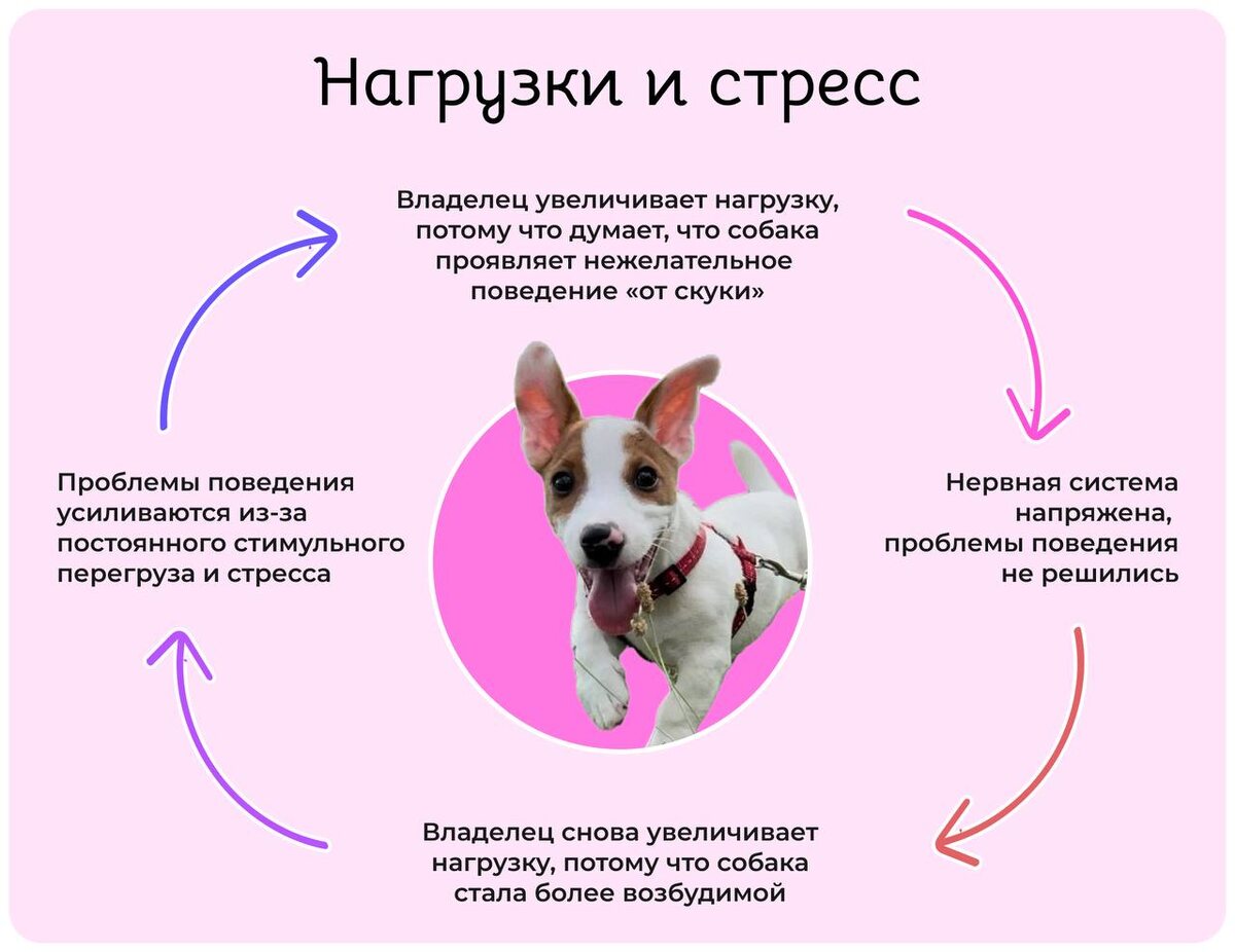 Собакам, как и людям, нужен баланс между активностью и восстановлением. Мы часто думаем: «Собака бесится — значит, не выгулялась, не потратила всю энергию». Но правда в том, что повышенная активность не всегда про недостаток движения. Чаще это сигнал перегруза. Согласно исследованиям Beerda et al., 1999; Dreschel, 2010, у собак, которые не получают достаточного отдыха, повышается уровень кортизола. Это снижает способность концентрироваться, тормозит обучение и вызывает проблемы поведения. Часто владельцы попадают в ловушку: Собака возбуждена, «бесится», не может успокоиться. Кажется, что она не догружена. Начинаются дополнительные тренировки, долгие прогулки, активные игры. В результате возбуждение усиливается, а собака перестаёт «выключаться». Потому что когда двигательная активность увеличивается, соответственно начинает преобладать работа симпатической НС. Поэтому снижается способность к обучению и поведенческие проблемы только усугубляются. Утомление не всегда приводит к расслабле