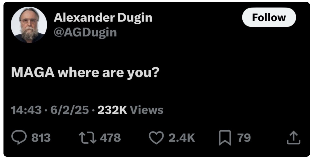 Ну как обычно.. прошло 3 дня.. а где ж глава страны, в которой самолеты горят, мосты падают? Не пора ли обратиться к нации? Причем почему то его наставник обращается к .. Трампу!? А что, у Трампа в америке что то горит и взрывается? 117 пострадавших в Брянской области - в Америке? Мага то тут причем? Дугин что, ждет что он по попе Зеленского нашлепает? Впрочем.. родил.. Безусловно важно.. Особенно когда в стране ЧП - 10-30% самолетов уничтожено, а он про культурку?? Повезло что НАТО на войну не явилось, а то было б неловко - сразу наловить полную панамку.. Тем временем передовицы Я не понимаю, как такое может быть - 118 пострадавших ! и? молчать будем? Опять "Она утонула".. эх.. Не зря про него хорошая дразнилка есть