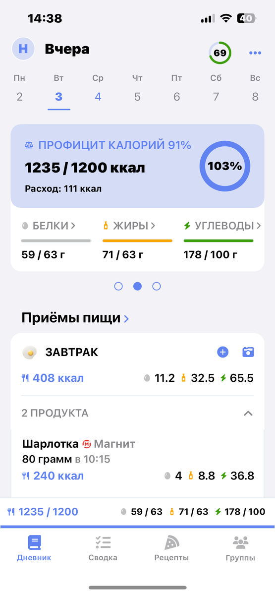 Вес 76.2 ( н в 78.8, -2,6 ) Кл- 1235 Спорт - 35мин, 9,5км, 111кл Завтрак - латте и 80гр домашней шарлотки из цз муки Обед- гречка 100г, куриная подлива 150р, горошек 150р, хлеб Ужин - латте , протеиновая вафля 1 Перекус - чай и 1 печенье посиделкино