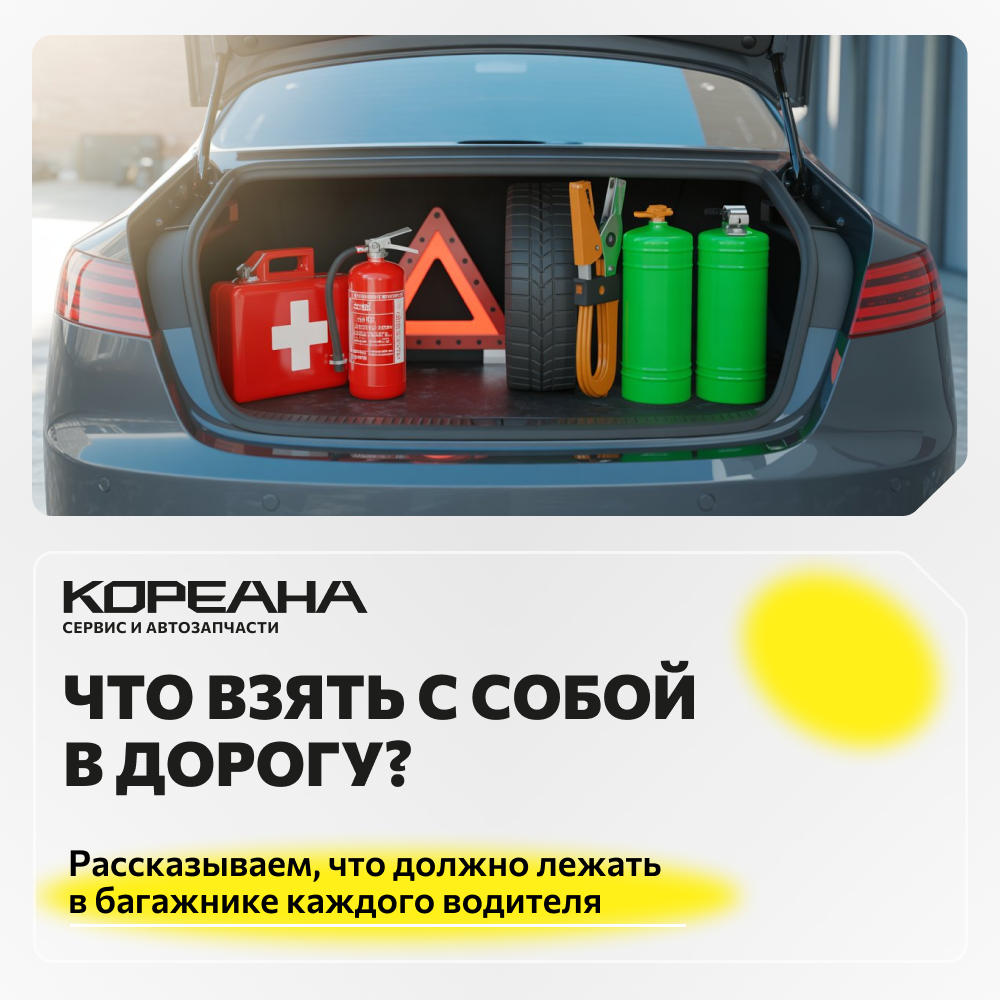 Рассказываем, что должно лежать в багажнике каждого водителя. Дальняя поездка — это всегда приключение, но чтобы избежать неприятных сюрпризов на дороге, важно быть подготовленным заранее. Ключевой аспект подготовки — правильное оснащение багажника автомобиля. В этой статье мы расскажем, что должно быть в багажнике, чтобы в дороге вы были готовы ко всему. Знак аварийной остановки и светоотражающий жилет При вынужденной остановке на дороге предупредите других водителей и сделайте себя видимым. Знак нужно поставить на расстоянии 15 метров в городе, и 30 на трассе. Жилет — надеть при выходе из машины. Аптечка первой помощи Содержимое аптечки включает в себе бинты, пластыри, антисептики, жгут, ножницы и базовые лекарства. Расположите её в доступном месте, чтобы в экстренной ситуации ее было легко найти. Автомобильный огнетушитель Пожар — редкое, но опасное событие. Наличие огнетушителя поможет быстро справиться с возгоранием и сохранить жизнь и имущество. Не забудьте проверить срок годност