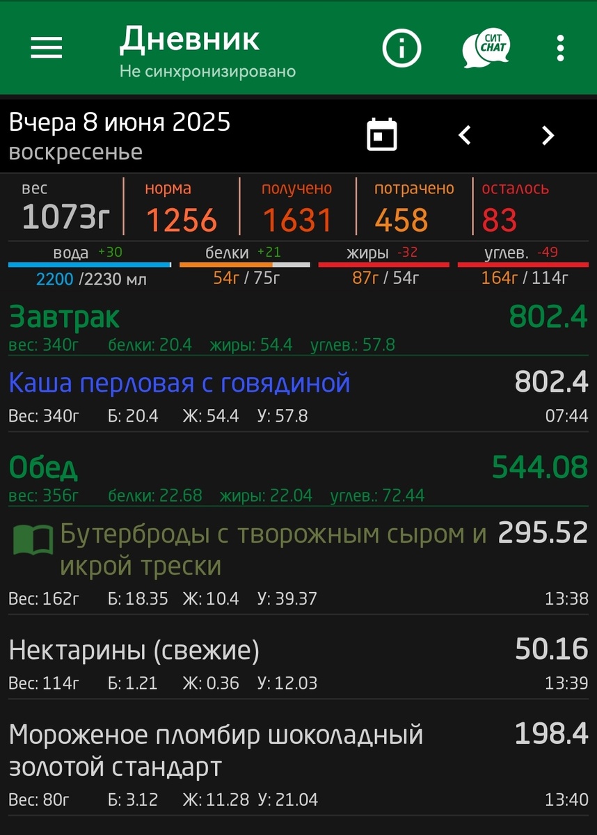 🥑 Я худею. 📌 Отчёт по калориям за 08.06. - 09.06.25
