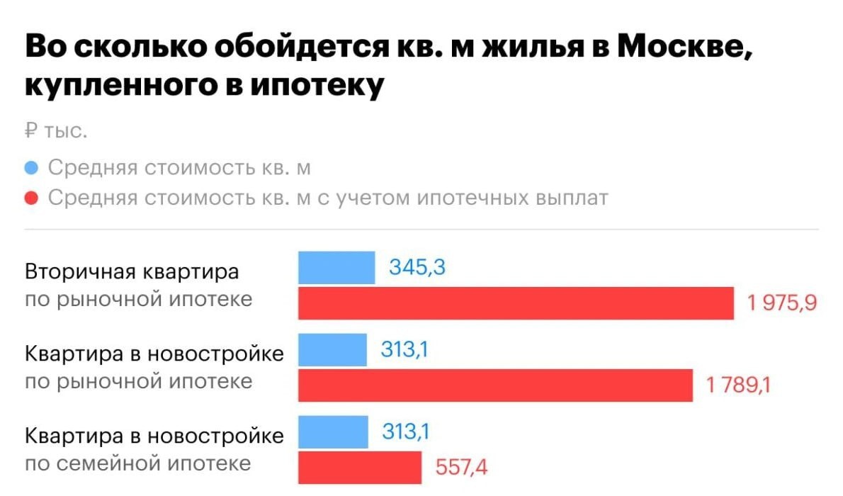 Цены на жильё в столице достигли парадоксального уровня: ипотечный квадратный метр обходится в 2 млн рублей, тогда как при полной оплате — всего 345 тыс.. Разница в 6 раз — следствие высоких ставок и длинных сроков кредита.