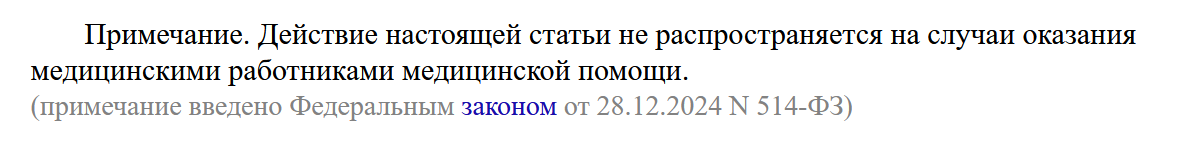 При формировании Уголовного кодекса РФ законодатели заложили статью 238 УК РФ, которая предусматривает ответственность за оказание услуг, не отвечающих требованиям безопасности. Вводя примечание, которое исключает ответственность врачей, законодатель заложил противоречие. Выходит, что врач может оказывать небезопасную услугу, хотя совершенно не ясно, почему врач, работающий непосредственно с человеческой жизнью, вправе не соблюдать требования безопасности при оказании медицинских услуг.