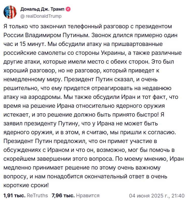 Таким раздраженным Путина давно никто не видел. Маловероятно, что целью будет Зеленский, как главный террорист, но шанс на то, что действительно будут удары по центрам принятия решений, есть. Характерно, что Трамп написал о звонке Путина с пониманием, но акцент на аэродромы, а не гражданских лиц. Про прямую связь между ходом украинского конфликта и переговоров США-Иран, писал на платформе по подписке. Сейчас Трамп также связывает это воедино. Кроме того, прошла информация от главы комитета по вооруженным силам сената США, о том, что Трамп попросил отложить рассмотрение законопроекта о санкциях против России. Таким образом, летом нас ждет этап эскалации СВО и это норма в процессе урегулирования аналогичного рода конфликтов. ℹ️ Только сегодня писал: Я пока не вижу перспектив изменения динамики ситуации, без про-активных действий Москвы. Будем надеяться, что Кремль решился на про-активные действия.