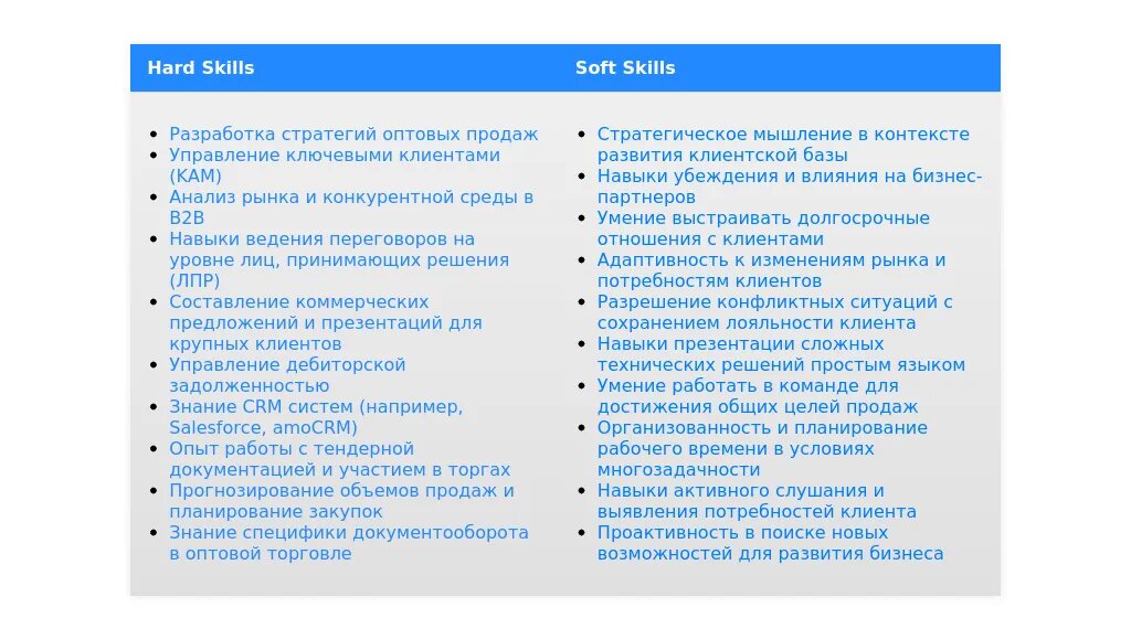 "Перевыполнение плана продаж" - Для вакансий, связанных с управлением ключевыми клиентами:"Ведение переговоров с ключевыми клиентами на уровне первых лиц"