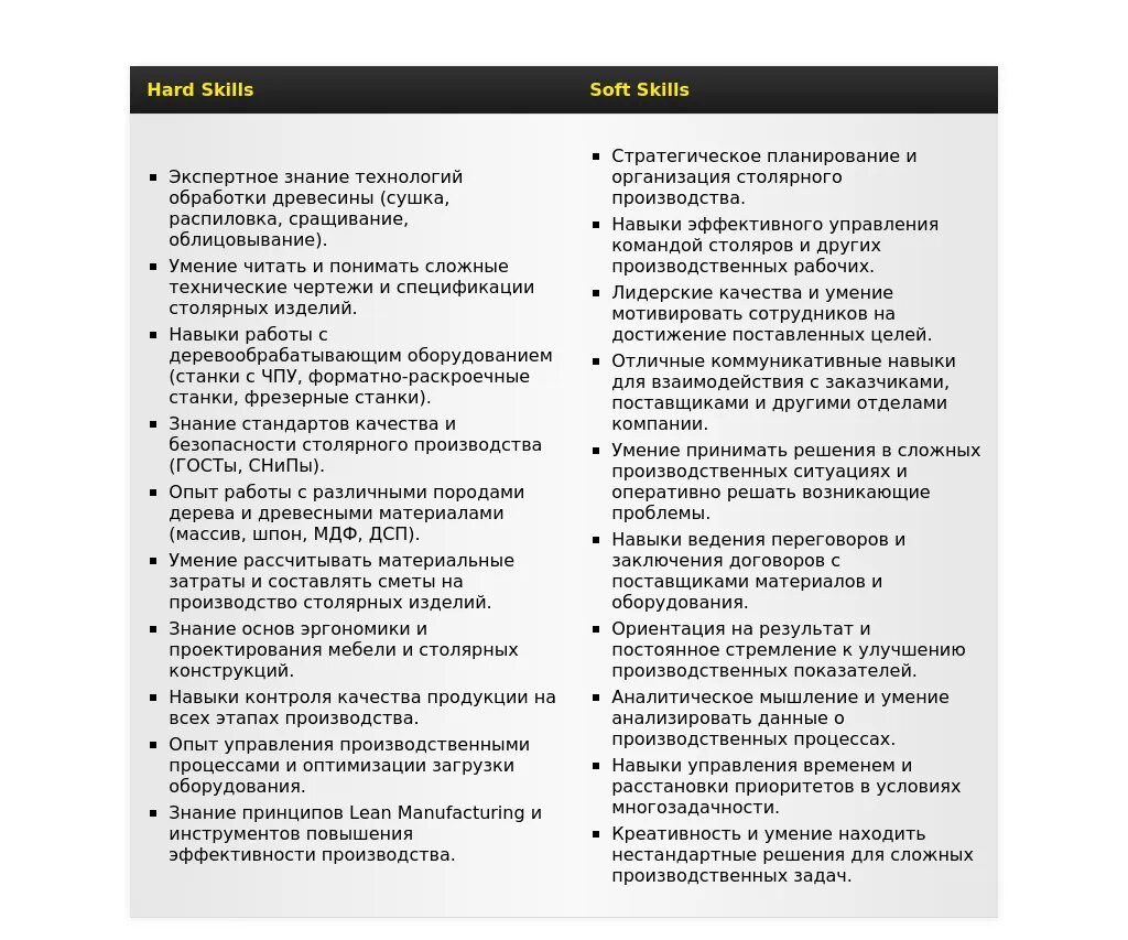 - На какие качества и навыки делать акцент: Ответственность, внимательность к деталям, умение работать с чертежами и технической документацией, знание технологий деревообработки, организаторские способности, лидерские качества.