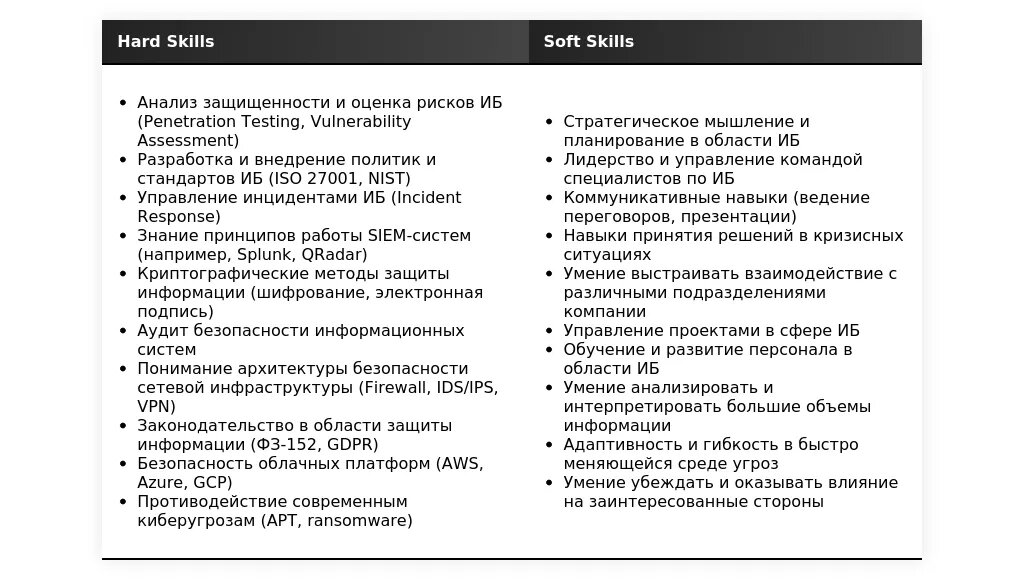 "Технические навыки: SIEM (эксперт), IDS/IPS (продвинутый), WAF (продвинутый), антивирус (средний), межсетевой экран (эксперт). Навыки управления: Управление командой (5+ лет), управление проектами (Agile), управление рисками. Коммуникативные навыки: Ведение переговоров, презентации, деловая переписка."