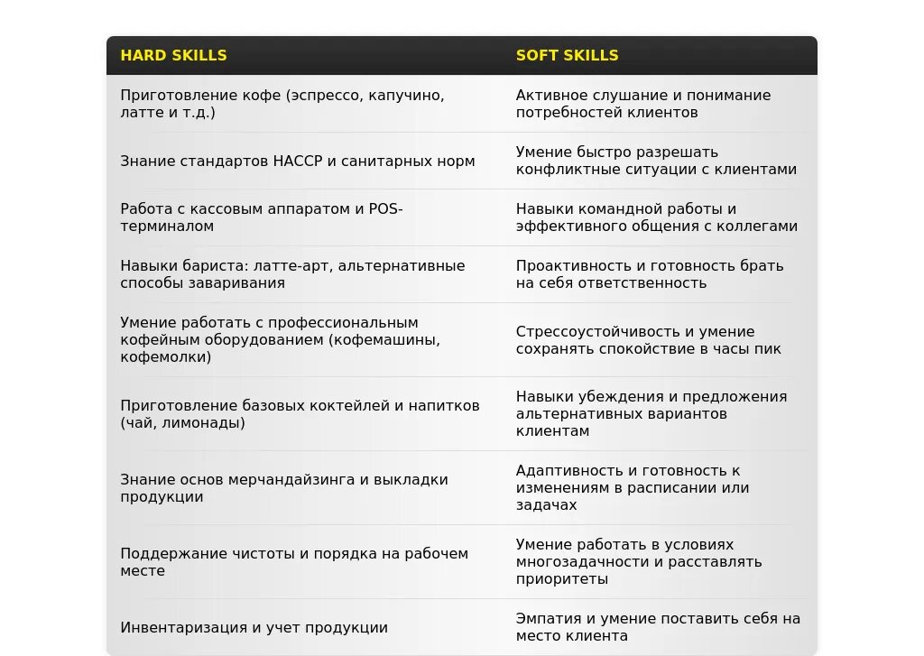 - Бариста: "Приготовление кофе", "Работа с кофемашиной", "Знание различных способов приготовления кофе", "Латте-арт".