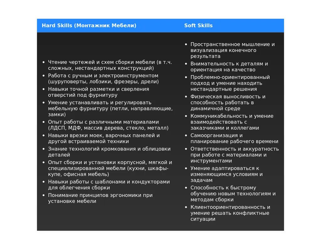 - Скрытые требования: (Исходя из типа мебели) Аккуратность, внимательность к деталям.