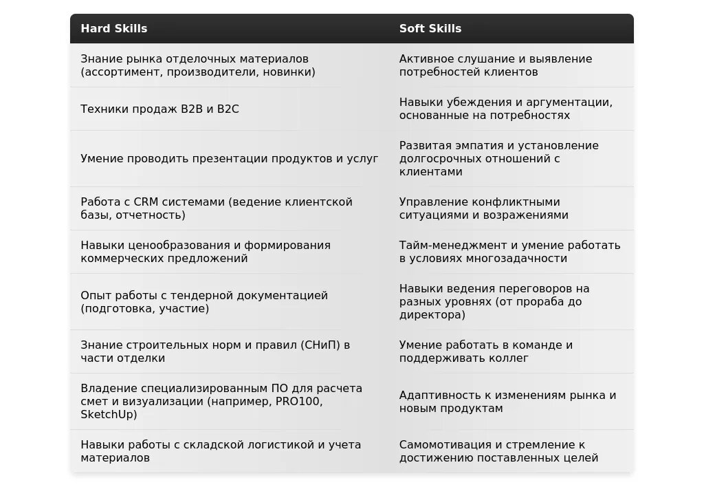 - Профессиональные навыки: "Продажи отделочных материалов", "Развитие дилерской сети", "Ведение переговоров", "Работа с CRM", "Знание рынка отделочных материалов".