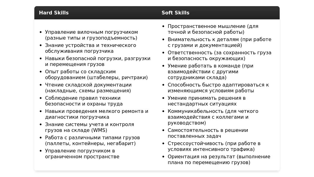 - Hard Skills: Управление вилочным погрузчиком, управление фронтальным погрузчиком, управление телескопическим погрузчиком, знание правил техники безопасности, обслуживание погрузчика, выполнение мелкого ремонта.