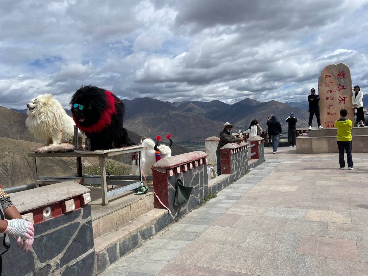 Обязательными атрибутами всех смотровых площадок и прочих достопримечательных мест по дороге являются стела с указанием места, как правило на китайском и тибетском языках, многочисленные сувенирные лавочки и нарядные животные, с которыми можно сфотографироваться за небольшую плату – яки, тибетские мастифы и козочки. Ну, и ещё, конечно, нарядные китайские девчонки, которые любят устраивать фотосессии в подобных местах.