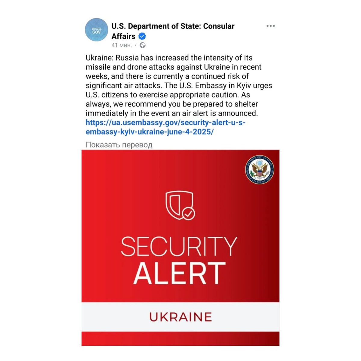В США видимо тоже послушали заявление Путина и американское посольство на Украине предупреждает своих граждан о повышенной опасности «серьезной воздушной атаки». Хохлы, а вы готовы к 🌰 😏 upd: на запрещённую в России Facebook ссылку давать не будем) Подписаться на канал | Наш чат Мы в ВКонтакте