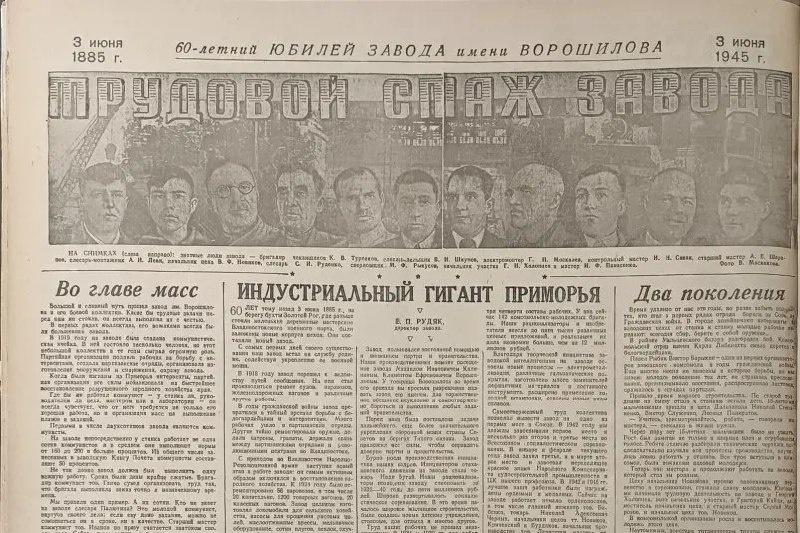 Владивостокский Дальзавод, которому в 1945-м исполнилось 60 лет (хотя на самом деле 140!), отмечал юбилей с размахом! Строили корабли ещё с 1889 года, даже кружок социал-демократов там был! В войну снабжали фронт рыбой, а на 60-летие встречали Героев Советского Союза. Короче, крутой завод, гордость Приморья!