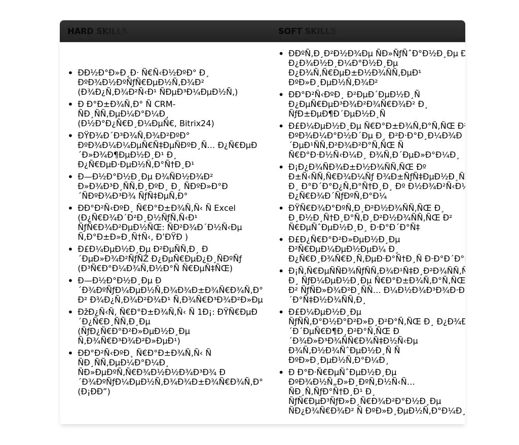 - Делайте акцент на качества и навыки: Коммуникабельность, внимательность к деталям, умение работать с информацией, знание Excel и CRM-систем.