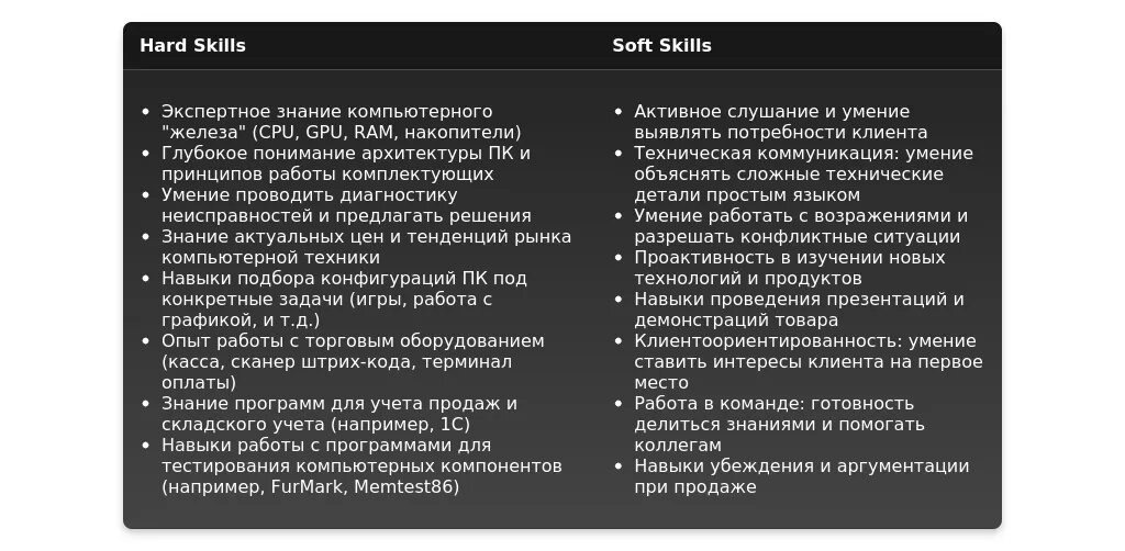 "Навыки продаж, консультирование клиентов, знание компьютерной техники (ноутбуки, ПК, комплектующие), работа с кассой, знание 1С, коммуникабельность, умение работать в команде."