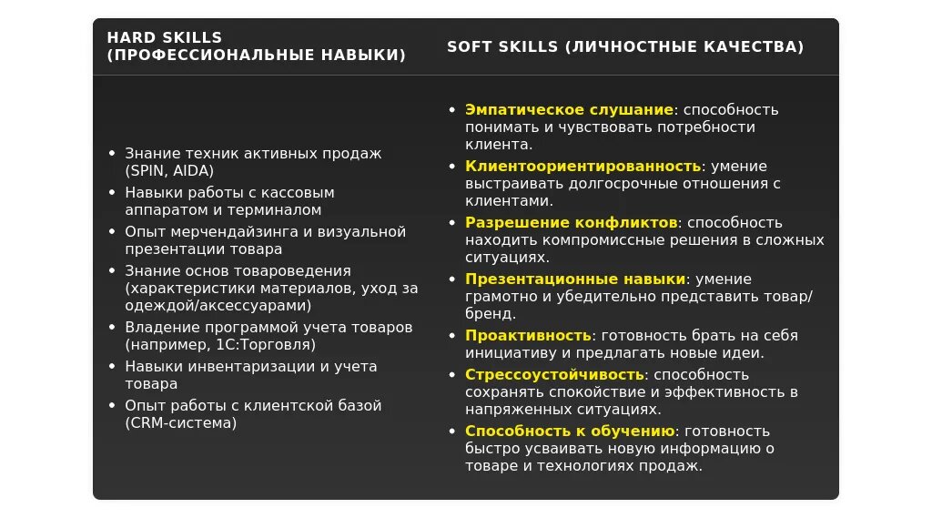 Раздел "Навыки" – это список ваших профессиональных навыков и личных качеств, которые необходимы для успешной работы на данной позиции. Важно, чтобы этот список соответствовал требованиям вакансии.