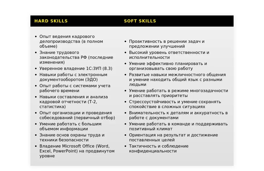 - На какие качества и навыки делать акцент: Внимательность, ответственность, организованность, коммуникабельность, знание основ кадрового делопроизводства, умение работать с компьютером и офисными программами.