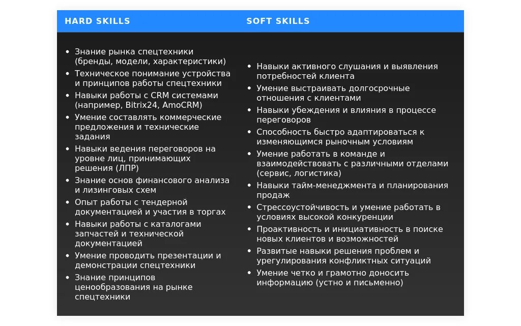 - перечень актуальных навыков для менеджера по продаже спецтехники