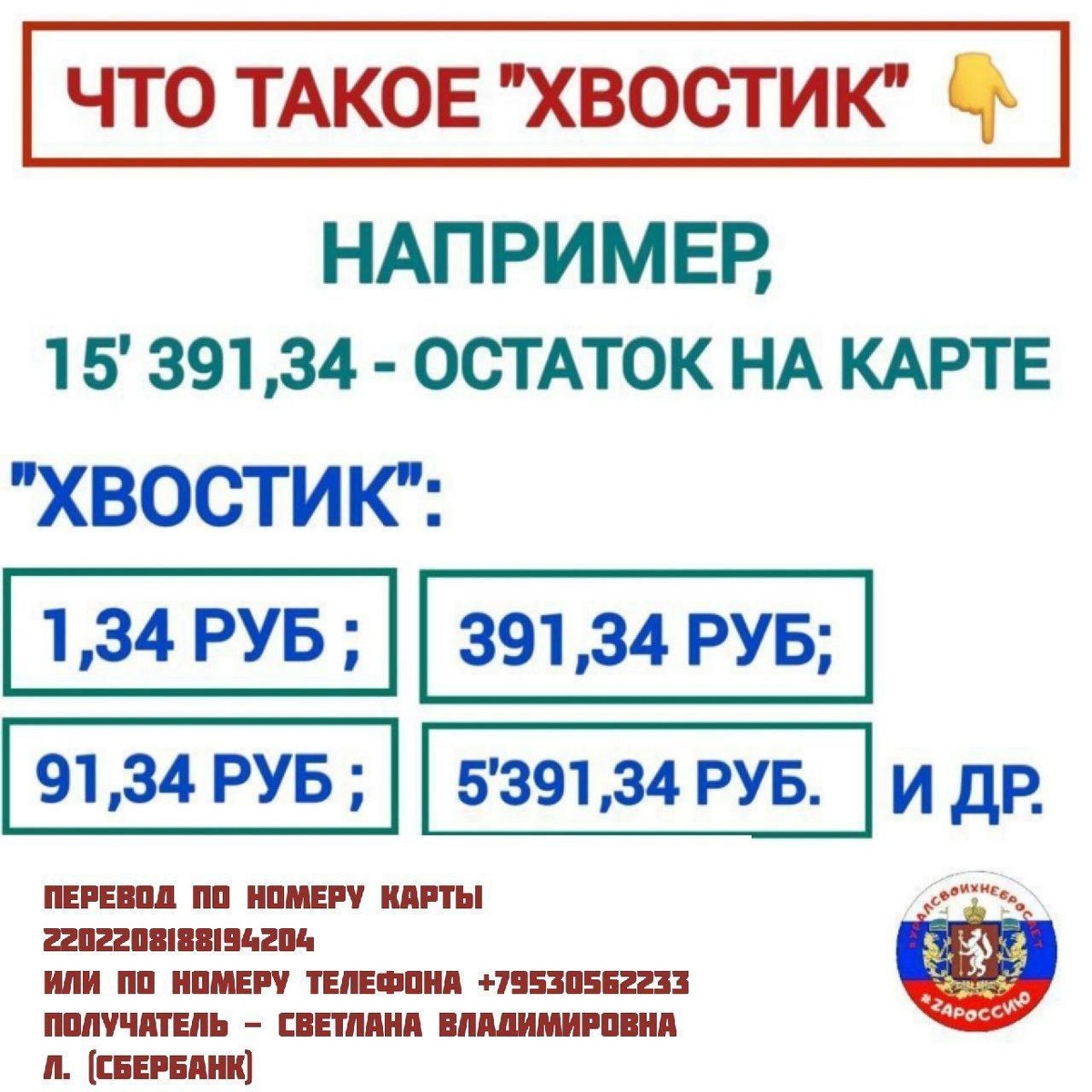 Поддержим разведку "хвостиками"?! Что такое "хвостики"? 👇 Например, у вас на карте 15'391,34. Можно перечислить на нужды фронта: - 1,34 руб ; - 91,34 руб ; - 391,34 руб; - 5'391,34 руб. А можно и свою сумму. Не бывает маленькой помощи. Она ценна сама по себе. Присоединяйтесь и делитесь! Не проходите мимо, друзья. Все средства будут направлены на покупку детектора БПЛА "Булат". Перевод можно совершить: 💳 по номеру карты 2202208188194204 или по номеру телефона 📲 +79530562233 Получатель - Светлана Владимировна Л. ("Сбербанк")