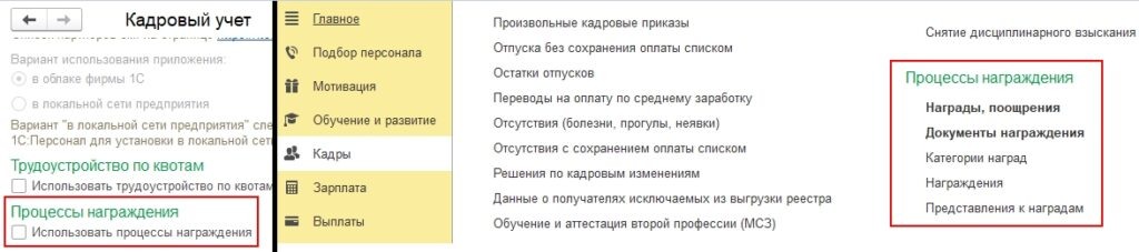 - Добавлено два новых документа Награждение и Представление к награде которые входят в подсистему «Процессы награждение». Включается в разделе Настройки -> Кадровый учет.