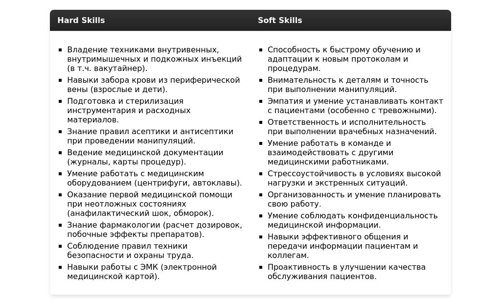 - Навыки **забора крови из вены** (вакуумными системами, катетером)