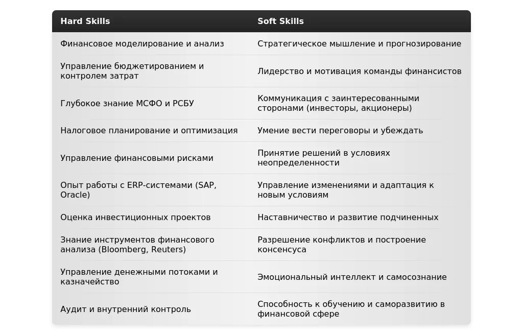 - Для вакансий в крупных компаниях: "Опыт работы с бюджетами от…", "Опыт управления командой от…", "Опыт работы с ERP-системами (SAP, Oracle)", "Опыт подготовки отчетности по МСФО/US GAAP".