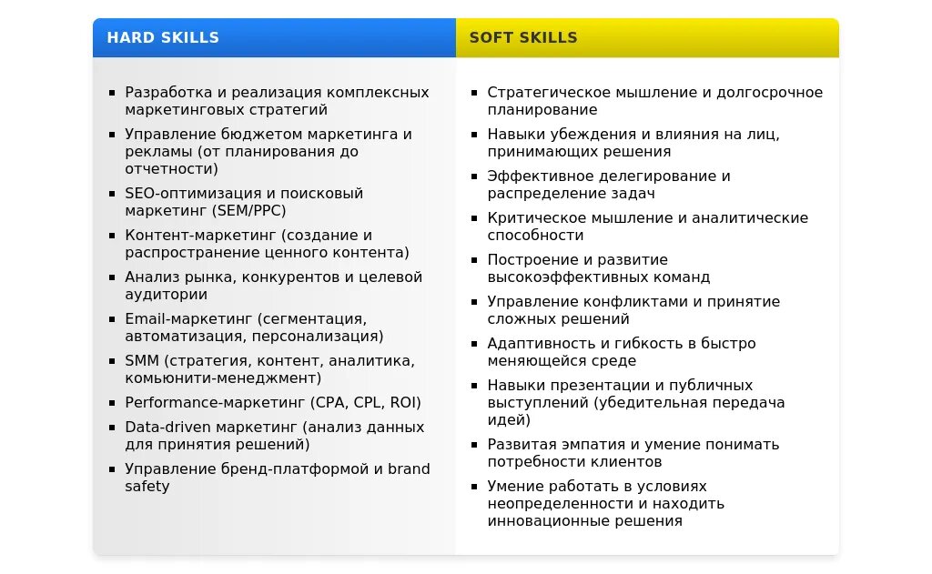Digital-маркетинг: SEO, SMM, Контент-маркетинг, Performance-маркетинг, Email-маркетинг. Аналитика: Google Analytics, Яндекс.Метрика, Google Tag Manager. Управление командой: Agile, Scrum, Kanban. Программное обеспечение: CRM-системы (Salesforce, Битрикс24), Marketing Automation (HubSpot, Marketo)."