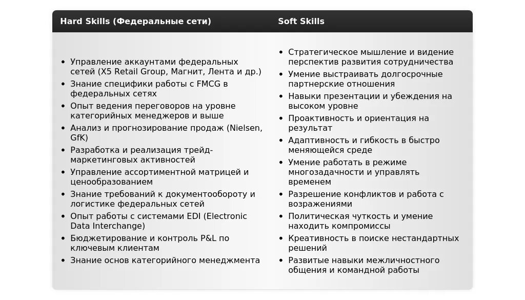 - Для вакансий, требующих опыта работы с федеральными сетями: "Успешный опыт ведения переговоров с...", "Развитие партнерских отношений с...", "Увеличение объемов продаж в сети... на X%".