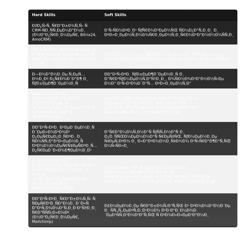 - Укажите на владение необходимыми инструментами (CRM-системы, программы для обработки данных).