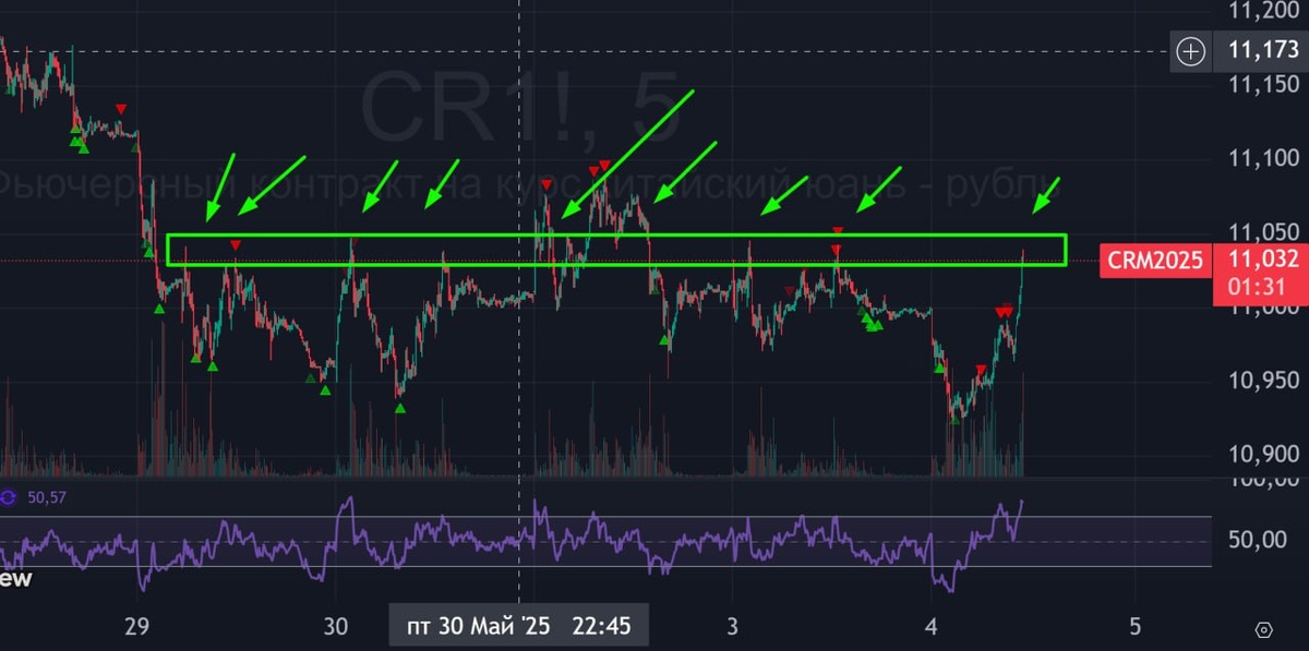 🟢 Тут по прежнему ничего интересного не происходит пока что - накопление несколько дней. Крутимся около 11,00 по фьючерсному графику.