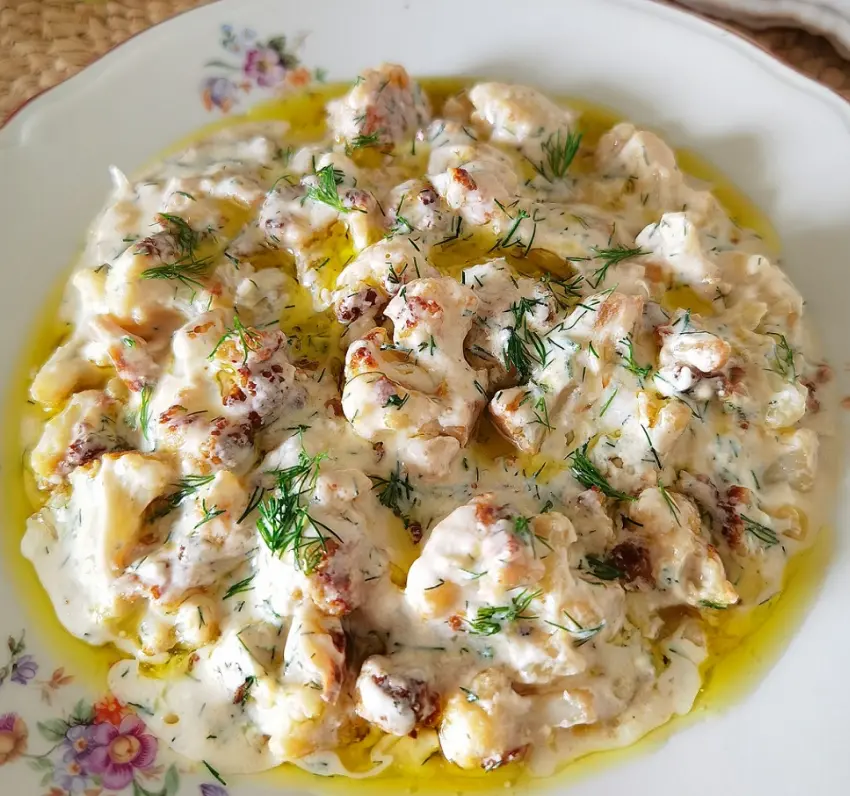Можно есть как теплым, так и остывшим с домашним хлебом или лепешками. небольшой кочан цветной капусты (около 600 г) 300 гр. жирной сметаны или натурального йогурта 3 зубчика чеснока 3 веточки укропа соль (мелкомолотая морская соль) масло растительное масло сливочное несколько капель оливкового масла для украшения Нарезать капусту на очень маленькие соцветия, промыть проточной водой. В сотейнике разогреваем 3 ст. л. масла и 1 ст. л. сливочного масла. Выложить соцветия цветной капусты. Немного присолить и тушить в течение 10-15 минут под крышкой нас слабом огне, пока капуста не станет мягче и не начнет прижариваться до золотистого цвета. Добавить давленые зубчики чеснока, перемешать и, как только они выпустили свой восхитительный аромат, снять посуду с огня. Чеснок не следует жарить долго, так как он может стать горьким. Готовим соус. В миске смешать сметану или йогурт с укропом. Немного присолить и поперчить. Заправить соусом горячую капусту. Выложить на тарелку и красиво каплями